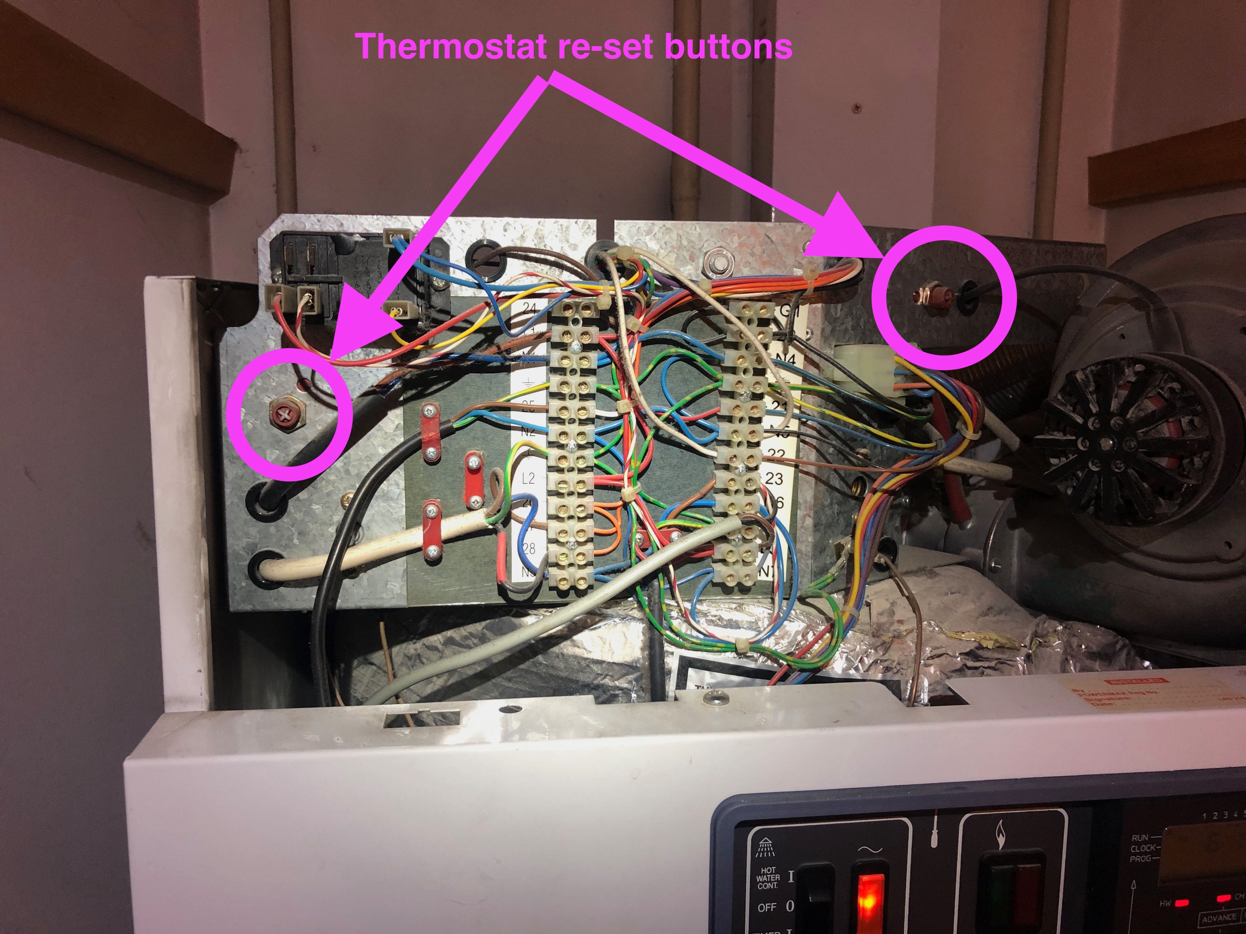 The Powermax runs a pump while the burners are alight to prevent stratification in the heat store. If the pump stops running, stratification occurs and the boiler overheat thermostat trips, turning the boiler OFF. A visiting technician will often spot this tripped thermostat and re-set it, then declare the boiler 'fixed'. The problem will return though unless s/he also addresses the reason for the tripping. The pump which ought to be running is operated by a relay on the upper left hand side of the wiring panel. This relay is very prone to failure and will usually be found to have failed whenever the overheat thermostat has tripped. An easy repair but one which foxes many inexperienced technicians.